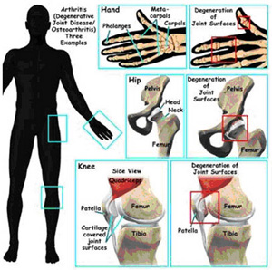 The most common type of arthritis is osteoarthritis. It results from overuse, trauma, or the degeneration of the joint cartilage that takes place with age. Osteoarthritis is often more painful in joints that bear weight, such as the knee, hip, and spine, rather than in the wrist, elbow, and shoulder joints. However, joints that are used extensively in work or sports or joints that have been damaged from fractures or other injuries may show signs of osteoarthritis. Other disorders that injure or overload the articular cartilage may lead to osteoarthritis.