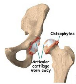 This drawing of an arthritic hip shows how the cartilage covering the leg bone (femur) and the acetabulum of the hip become damaged over time.