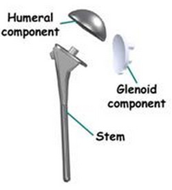 There are several different types of shoulder replacements. The usual total shoulder replacement involves replacing the arthritic joint surfaces with a highly polished metal ball attached to a stem, and a plastic socket.