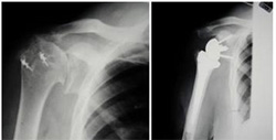 X-Rays before and after reverse total shoulder replacement for cuff tear arthropathy